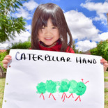 We made a caterpiller with our hands' painting. We were so excited. 手のひらの手型でかわいい青虫を作りました。 Hicimos una orugacon nuestras manos pintadas.