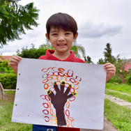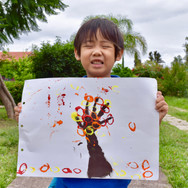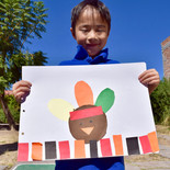 K2&K3 We made an Andy Warhol hand print painting. Each of us chose the colors to paint. Hicimos una pintura de Andy Warhol con huellas de las manos. Cada niño escogió los colores que quería usar para pintar. 年中年長はアンディ・ウォーホルの手型アートを作りました。4つに分けた画用紙を好きな色で塗り、その上に手型を押しました。