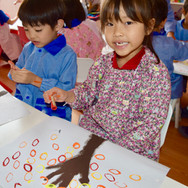 K2 & K3 We painted a Winter Tree, using crayons, paintbrushes and fingers. Pintamos un Árbol de Invierno, usando crayones, brochas y los dedos. 冬の木 クレヨンで背景を塗った後、ブラシで木の幹を描き、最後に指で雪の模様をつけました。